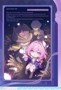 Everyone sacrificed so much to let the Coreflames drift safely through the river of time, and what I did was just the tiniest ripple among them all. A thousand years of waiting… it does sound incredibly long, doesn't it? But back then, knowing you could return to Amphoreus any morning made every tomorrow worth looking forward to! Sometimes I'd let my hopes run wild and wonder: While so many days and nights have passed in this world, perhaps a single grain of sand has already fallen in the hourglass beyond the Exomyth? So, don't worry about how I was back then. Even if there were many moments of sadness during those thousand years of waiting, just thinking of you would give me the courage to smile again. After all, I wouldn't want you to catch me crying right when you returned.