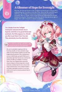 “I'm a healer from the Twilight Courtyard. Everyone knows me as Hyacine. And this is my good friend and assistant, the little pegasus Ica. Would you like to pet them? Don't be shy! They absolutely love the attention~.”