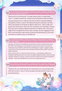 Among my patients was a craftsman who lost his left arm repairing buildings damaged by Titankin, a warrior who died protecting his hometown, and many others who quietly served during our fight for deliverance… But in reality, few people know their names. That's why I do everything I can to heal them, stand by their side, and record these brilliant moments from ordinary lives. Their stories might not be as magnificent as heroic epics, perhaps not even engaging to most. But it's precisely these small, ordinary moments that add vibrancy to our world and make our collective story so colorfully rich~.