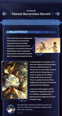 Back on the Express, Dan Heng learned that Remembrance had seized the opportunity to block all outside interference. Determined to find his companions, he returned to Amphoreus. With Khaslana's help, he opened the Memory Zone and reached the deepest place of Amphoreus beneath the Grove.