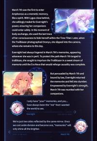 March 7th was the first to enter Amphoreus as a memetic memory, like a spirit. With Lygus close behind, she willingly traded for Evernight's power, ensuring her companions could enter safely. In the moment of body exchange, she used the last trace of her consciousness to hide herself within the Time Titan. Later, when the Trailblazer photographed Oronyx, she slipped into the camera, where she remains to this day.