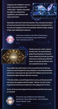 Anaxa, hidden deep within Zandar's mind, uncovered the truth of Demiurge. Hysilens journeyed alongside Dan Heng, helping him confront Mountainbreaker and Terravox. Castorice gave her all to protect the Trailblazer and Chrysos Heirs, thwarting Evernight's attempt to filter their memories.