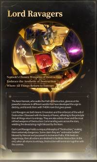 Lord Ravagers are both Aeonic Emanators and the enforcers of the will of Destruction: Obsessed with the beauty of havoc, adhering to the principle that all things return to entropy. They are also artists of war and the most refined weapons of Destruction: Commanding wars across the stars, wielding the devastating might blessed by the Aeon.[1]