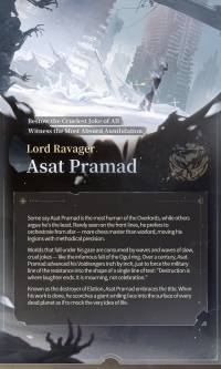 Some say Asat Pramad is the most human of the Overlords, while others argue he's the least. Rarely seen on the front lines, he prefers to orchestrate from afar — more chess master than warlord, moving his legions with methodical precision.