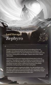 Many believe Zephyro's targeting the Nihility. One Self-Annihilator once described a nightmare: At the end of all things, with nothing left to destroy, a Lord Ravager hurled himself into IX's divine corpus, followed by a single, violent beam of white that pierced the endless darkness.