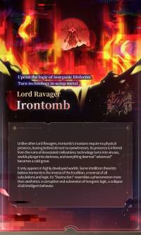 Unlike other Lord Ravagers, Irontomb's invasions require no physical presence, leaving behind almost no eyewitnesses. Its presence is inferred from the ruins of devastated civilizations: technology turns into viruses, worlds plunge into darkness, and everything deemed “advanced” becomes a cold grave.