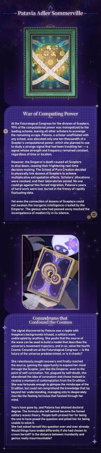 However, the Emperor's death caused all Scepters to shut down, ceasing their frightening real-time decision-making. The School of Pure Creation decided to physically link dozens of Scepters to achieve multiplicative extrapolation effects. Scholars' allocations were revoked, and their laboratories seized. No one could go against this forced migration. Patavia's years of hard work were lost, buried in the frenzy of rapidly fluctuating data.