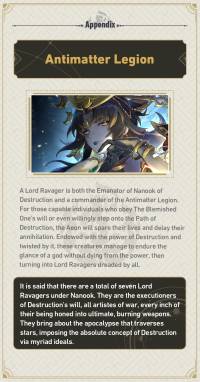 A Lord Ravager is both the Emanator of Nanook of Destruction and a commander of the Antimatter Legion. For those capable individuals who obey The Blemished One's will or even willingly step onto the Path of Destruction, the Aeon will spare their lives and delay their annihilation. Endowed with the power of Destruction and twisted by it, these creatures manage to endure the glance of a god without dying from the power, then turning into Lord Ravagers dreaded by all.