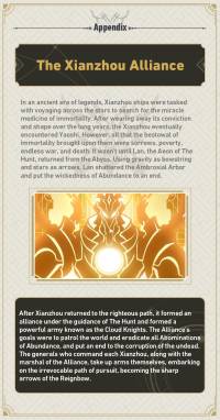 After Xianzhou returned to the righteous path, it formed an alliance under the guidance of The Hunt and formed a powerful army known as the Cloud Knights. The Alliance's goals were to patrol the world and eradicate all Abominations of Abundance, and put an end to the corruption of the undead. The generals who command each Xianzhou [ship], along with the marshal of the Alliance, take up arms themselves, embarking on the irrevocable path of pursuit, becoming the sharp arrows of the Reignbow.