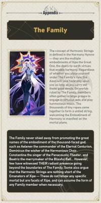The concept of Harmonic Strings is defined in the Harmony Hymns — they are multiple embodiments of Xipe the Great One, the down-to-earth virtues that enable harmony. Regardless of whether you place yourself under The Family's rule, the Aeon will look favorably upon you as long as you carry out these good deeds. On worlds ruled by The Family, members often gather in large groups to engage in virtuous acts and play harmonious music. The thousands of tiny ropes come together to form a united string, welcoming the Embodiment of Harmony to manifest on the mortal plane.