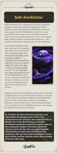 Self-Annihilators are a group that lost their meaning of existence when they carelessly stepped into IX the Nihility's shadow. The shadow of the Nihility covers the stars equally, and Self-Annihilators may form in any world. These poor souls share one thing in common: Their various existential properties — such as corporeal body, mental cognition, and personal memories… will gradually fade away in their journey of self-annihilation.