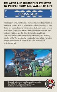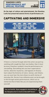 If there is a format through which the artist can portray anything with naught but their own bodies, then it must be every Xianzhou resident's favorite performance art: storytelling. Storytelling lets you hear supernatural stories, detective mysteries, and legends of chivalry; learn about the histories of rulers, heroes, and villains; you can even hear the more down-to-earth stories of everyday life. Stories from millennia past can be brought to life through verbal performances, which are so immersive that it feels like you are experiencing them yourself.