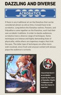 If there is any traditional art on the Xianzhou that can be considered almost as old as time, it would have to be acrobatics. Long before the Xianzhou natives, Foxians, and Vidyadhara came together on the Xianzhou, each had their own acrobatic traditions. In order to dazzle audiences, acrobatics have a diverse range of techniques. Some techniques are intense and highly demanding feats of physicality, while others are ingenious magics that trick the eyes. The latter type of techniques are often more well-received, since fresh and unusual content will always pique the audience's curiosity.