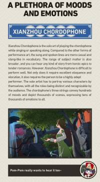Xianzhou Chordophone is the solo art of playing the chordophone while singing or speaking along. Compared to the other forms of performance art, the sung and spoken lines are more casual and slang-like in vocabulary. The range of subject matter is also broader, and you can hear any kind of story from heroic epics to tender romances. However, Xianzhou Chordophone is difficult to perform well. Not only does it require excellent eloquence and elocution, it also requires the person to be a highly adept performer. The sole artist has to portray various characters by themselves, with all the roles being distinct and recognizable by the audience. The chordophone's three strings convey hundreds of mods and depict thousands of scenes, expressing tens of thousands of emotions to all.
