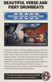 If you wish to attend a show by relatively younger performers, Pom-Pom recommends checking out Foxian Drum Chanting. The origin of this art dates back to when the Foxians first joined the Xianzhou Alliance, and Foxian traveling merchants would hit a cooking pot as they called out to promote their wares. The elegant verses of the songs are accompanied by the rhythm of a drum beat, perfectly portraying the Foxians' character of admiring heroism and romance, as well as their love for fierce combat and their passionate temperaments.