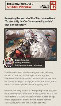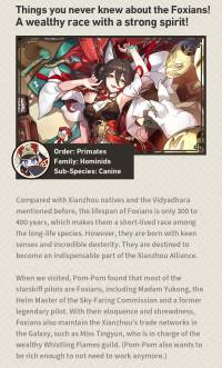 Compared with Xianzhou natives and the Vidyadhara mentioned before, the lifespan of Foxians is only 300 to 400 years, which makes them a short-lived race among the long-life species. However, they are born with keen sense and incredible dexterity. They are destined to become and indispensable part of the Xianzhou Alliance.